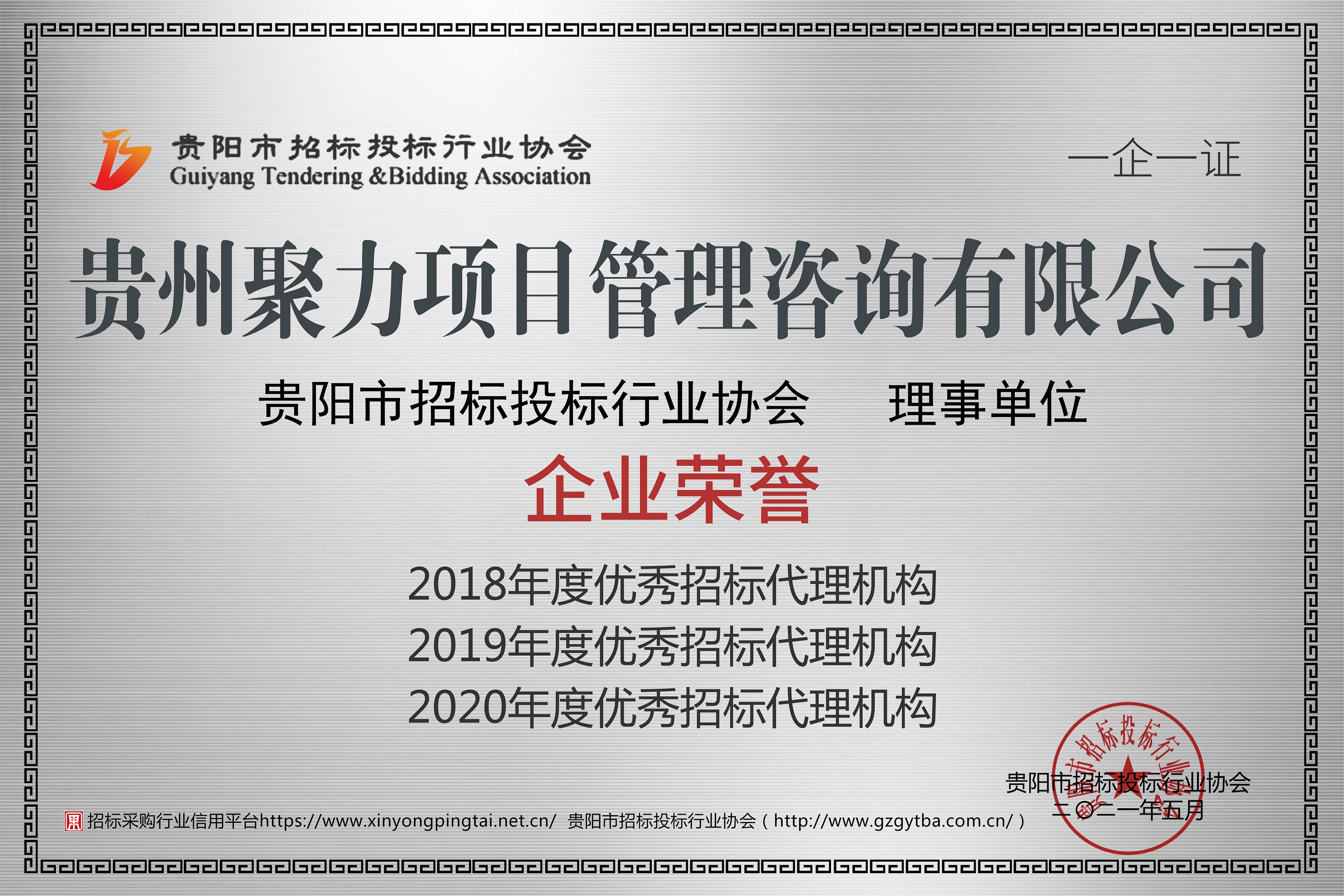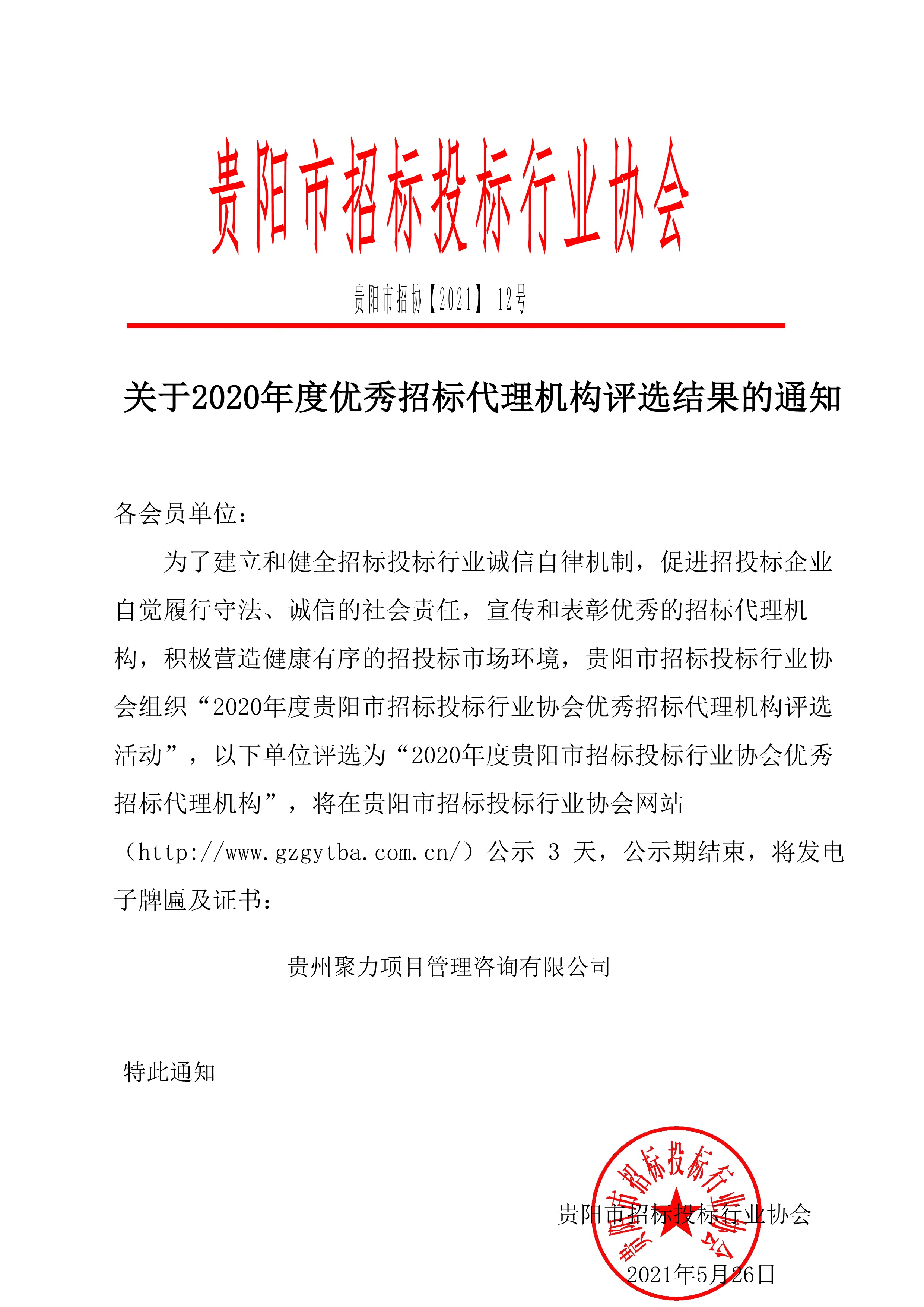 近日,贵阳市招标投标行业协会发布《关于2020年度优秀招标代理机构评选结果的通知》,我公司被评为2020年度贵阳市招标投标行业协会优秀招标代理机构。 此次评选是行业及主管部门对我们工作的认可和肯定,同时也是对我公司招标代理业务进一步发展的鼓励和期望。 公司将始终坚持诚信立企、守信经营,继续秉承“团队 诚信 创新 共赢”的核心价值理念,发挥诚信自律的示范作用,为推动我市工程建设项目招标代理市场平稳健康发展贡献自己的力量。